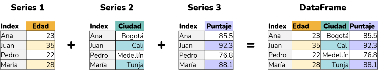 La imagen que se presenta a continuación, ilustra cómo combinar tres Series de Pandas en un solo DataFrame. En la primera serie ("Series 1"), cada persona está asociada con su edad; en la segunda serie ("Series 2"), con su ciudad; y en la tercera serie ("Series 3"), con su puntaje. Al combinar estas tres series por su índice común, se crea un DataFrame completo que incluye la edad, ciudad y puntaje de cada persona. Esta visualización demuestra cómo las series individuales se pueden consolidar en un DataFrame para facilitar el análisis de datos en Pandas.