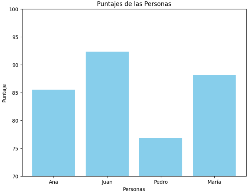 Utilizando los datos del DataFrame creado previamente en pandas, este ejemplo demostrará cómo visualizar los puntajes de varias personas mediante una gráfica de barras con Matplotlib. Esto te permitirá ver cómo combinar la manipulación de datos con pandas y la visualización de datos con Matplotlib de manera efectiva.
